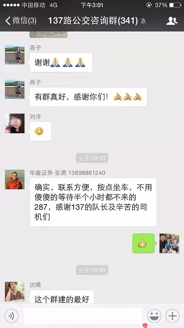 沈蘇公司137路車隊(duì)于2017年年底創(chuàng)新性的建立了137路車隊(duì)公交咨詢?nèi)海鸪踝稍內(nèi)褐挥卸怀丝?,三個(gè)月后,137路車隊(duì)咨詢?nèi)阂呀?jīng)達(dá)到了350人左右。咨詢?nèi)旱慕?,方便了乘客與車隊(duì)之間的溝通,車隔時(shí)間的變化車隊(duì)會(huì)在咨詢?nèi)褐械谝粫r(shí)間發(fā)出通知,使乘客出行更加便捷與高效。