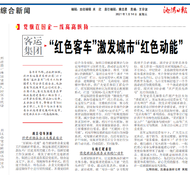 7月14日,沈陽日報以《 “紅色客車”激發(fā)城市“紅色動能”》為題報道了沈陽客運集團以黨建為引領(lǐng),助推企業(yè)高質(zhì)量發(fā)展之新變化。