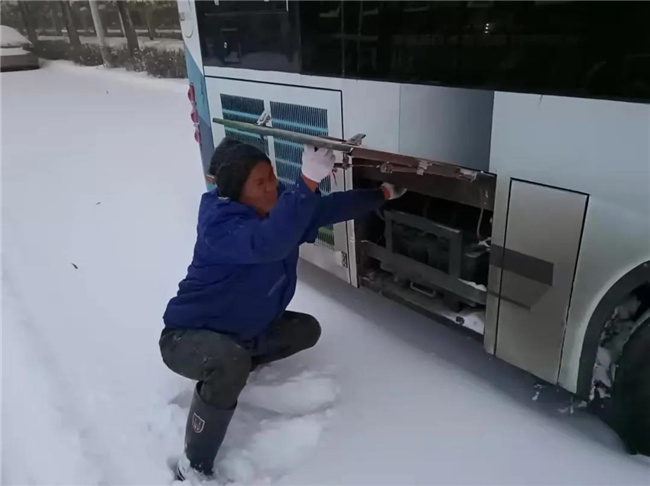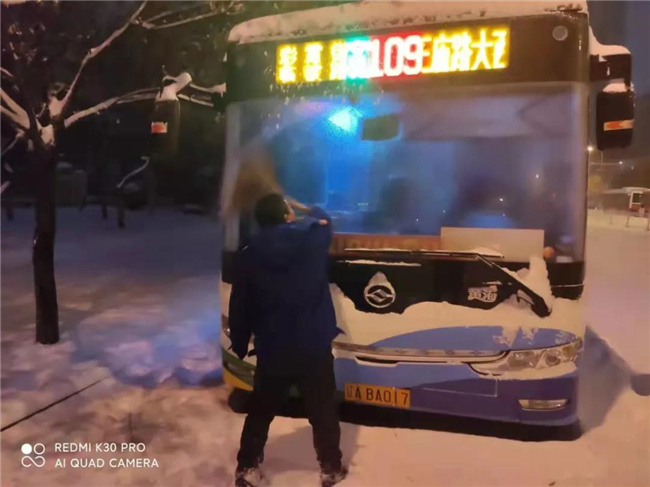 凌晨4點(diǎn)多,第一班車的駕駛員就已經(jīng)提前到崗,清掃積雪,預(yù)熱車輛...